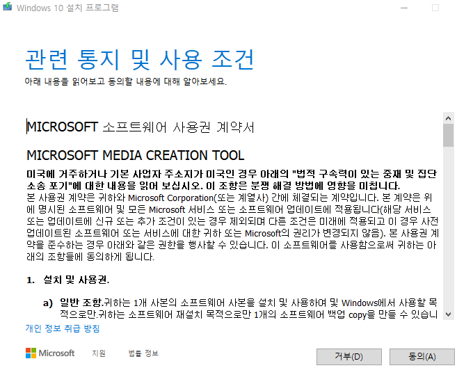 처음 파일을 실행하면 몇 가지 항목들을 준비한다는 내용이 나오는데, 그 상태로 기다리면 됩니다. 그리고 사용권에 대한 내용이 나오면 동의를 눌러야 윈도우10 usb 부팅디스크의 만들기를 진행할 수 있어요.