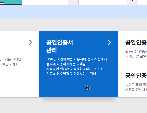 여담으로 이미 알고 계시겠지만, 지금 농협 공인인증서를 관리한 것처럼 다른 곳 역시 공식 홈페이지를 찾아가기만 하면 파일을 관리하는 것과 관련된 메뉴를 확인할 수 있습니다. 물론 작업하는 방식도 지금과 비슷해요.