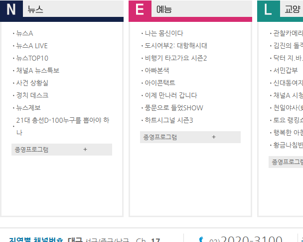 페이지를 찾아가보면 다양한 종류의 방송들이 표 안에 정리되어 있을 것입니다. 각각의 항목을 누르면 채널a의 온에어를 볼 수 있었던 것처럼 플레이어가 있는 곳으로 빠르게 이동할 수 있으니 편리할 거예요.