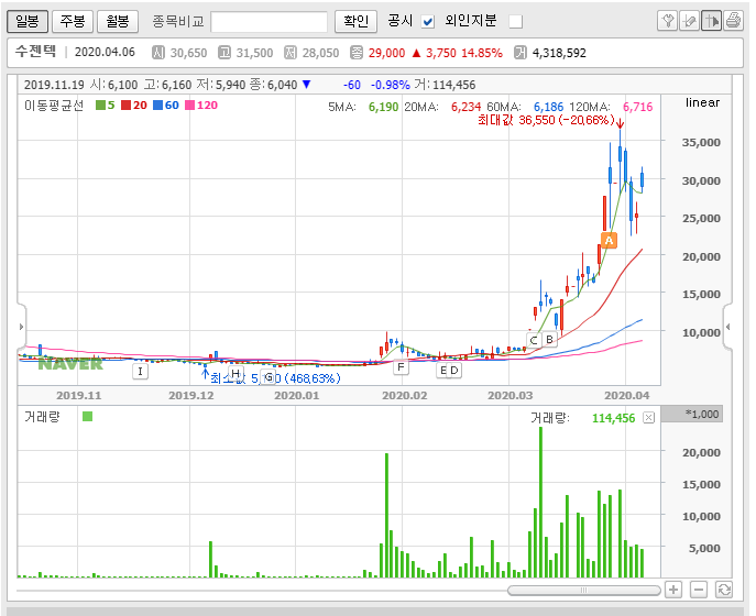 그리고 계속해서 상승하는 수젠텍 주가를 볼 수도 있고, 아니면 연달아 음봉이 나오면서 갑자기 상승파를 모두 되돌리는 그림을 볼 수도 있습니다.