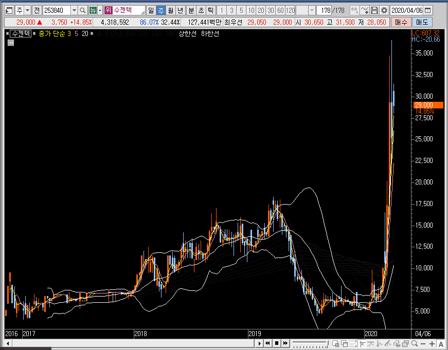 월봉차트를 보면 하락하고 몇 달동안 횡보를 한 뒤에 변동성을 키우더니 갑자기 지금의 상승파가 나온 것을 알 수 있습니다. 즉, 안목이 있으셨던 분들이라면 횡보구간이나 횡보구간 상단이 뚫릴 때 수젠텍의 주가를 공략하셨을 것입니다.