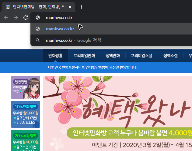 이번엔 조금 더 전문적인 페이지를 하나만 더 얘기해보도록 하겠습니다. 이번에 찾아가야 할 주소는 [manhwa.co.kr]입니다. 방문해보시면 아시겠지만, 확실히 전문적인 곳이예요.