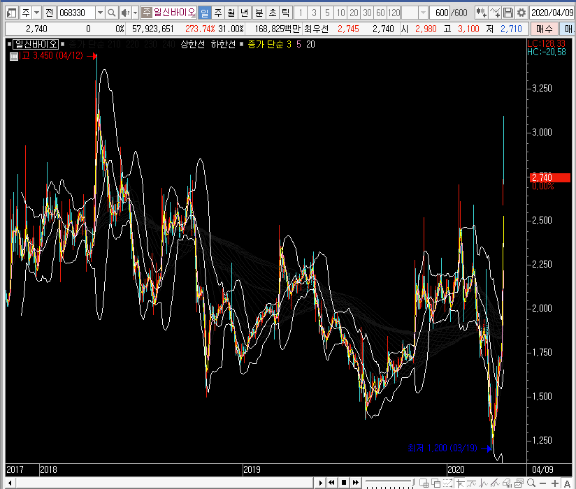 그래서 재료만 보면 분명 일신바이오의 주가에 공략해보는 것은 매력적으로 느껴집니다. 하지만 이미 많이 오른 종목이라는 함정이 있죠. 그래서 차트를 보면서 대응해야 할 듯합니다.