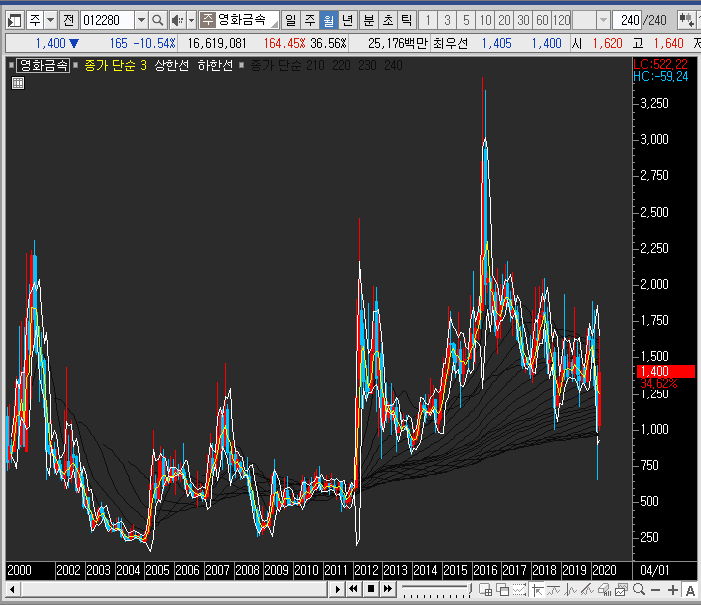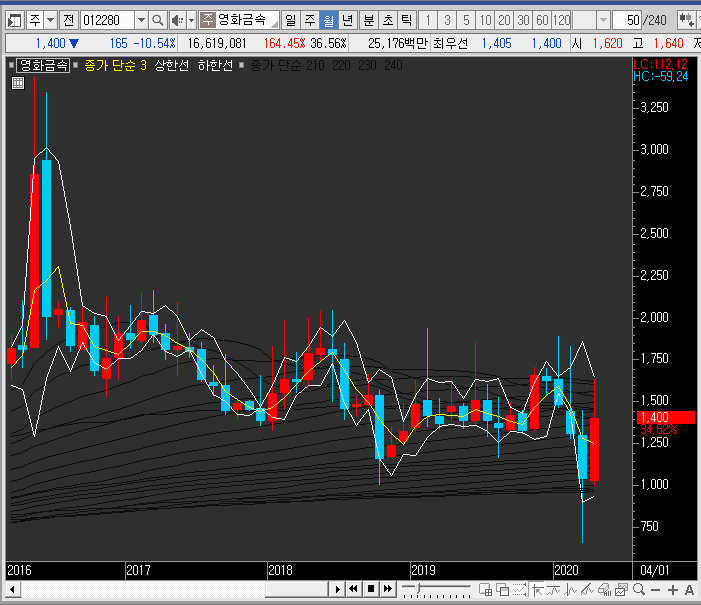 그런 의미에서 월봉차트부터 보겠습니다. 월봉차트로 영화금속의 주가는 하락추세에 있으며, 최근 네 달 동안 꼬리가 긴 음봉을 그리다가 드디어 양봉이 나오는 것을 확인할 수 있습니다.