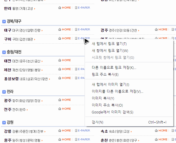 메뉴를 누르면 다양한 지역들이 정리된 페이지로 이동하게 되는데, 여기에서 벼룩시장 구인구직의 사이트처럼 일자리를 알아보고 싶은 지역을 고르고, 항목 우측에 있는 E-PAPER를 눌러주면 됩니다.