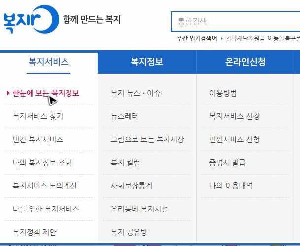 주소를 정확하게 입력해도 기초생활수급자의 혜택이 바로 보이지는 않을 거예요. 그래서 메뉴를 몇 가지 눌러야 합니다. 우선 상단의 복지서비스 카테고리에 커서를 올려주세요. 그리고 한눈에 보는 복지 정보를 클릭하면 됩니다.