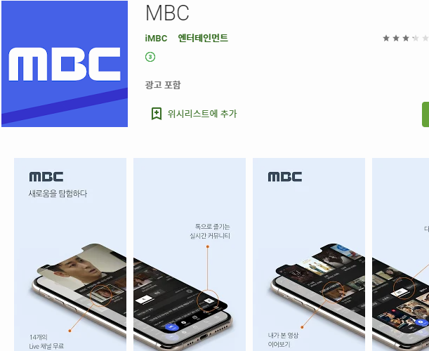검색하면 위 그림과 같은 엠비씨의 공식 어플이 보일 거예요. 설치하고 실행하면 됩니다. 설치와 실행은 이미 익숙하실 테니, 따로 설명해야 할 내용이 없을 것 같아요. 이상입니다!