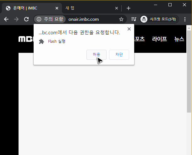 버튼을 누르면 엠비씨의 온에어를 보는 플레이어가 나올 거예요. 혹시 크롬을 쓰고 있어서 저처럼 활성화 관련 버튼이 나온다면, 그냥 그 부분을 클릭하고 기능을 켜주면 생방송 스트리밍을 볼 수 있습니다.