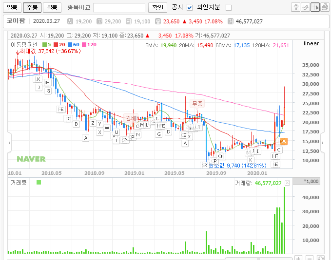 이 종목이 갖고 있는 재료, 차트의 움직임에 영향을 주는 소식들에 대해선 제가 하나씩 나열을 하더라도 이미 다 알고 계실 내용밖에 없습니다. 그래서 저는 차트로 코미팜의 주가를 살펴보도록 하겠습니다.