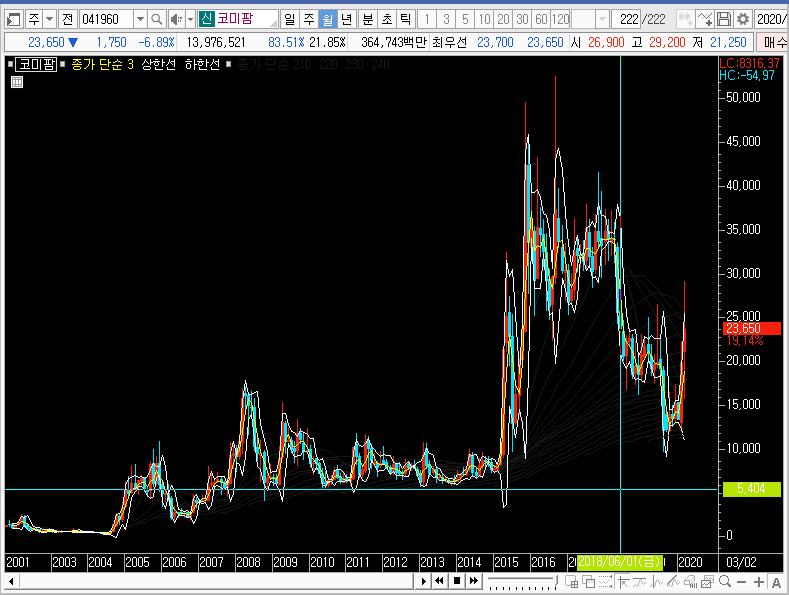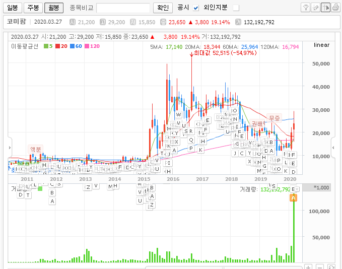 하지만 지금은 재료를 갖고 코미팜의 주가가 움직이는 중이며, 이미 알고 계시겠지만 사실 실적이 좋은 회사도 아닙니다. 그래서 월봉차트의 큰 그림은 어쩌면 전혀 의미가 없을지도 모릅니다.