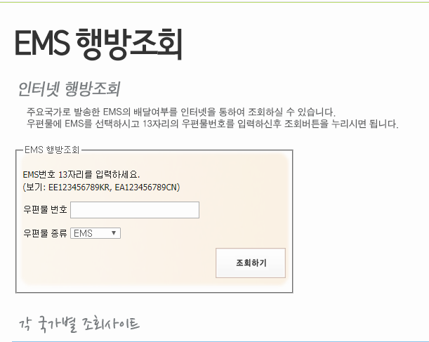 페이지를 찾아가면 앞서 우체국의 국제택배 배송조회를 위해서 방문을 했었던 곳과 마찬가지로 소포 트래킹 숫자를 적는 곳이 보이는데, 그 아래쪽에는 국가별 확인 사이트가 다시 정리되어 있어서 요긴하게 쓸 수 있을 것 같아요.