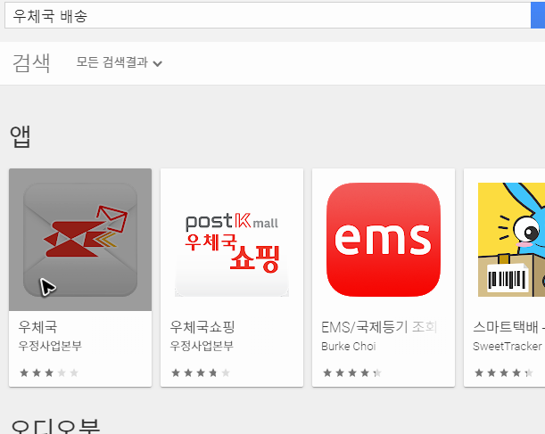 혹시 앱으로 우체국국제택배 배송조회를 하시려고 하신다면, 플레이스토어를 열어서 앱을 검색하면 됩니다. 몇 가지 종류가 나오는데, 적당히 하나를 준비해주세요.
