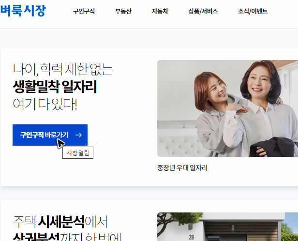 주소를 입력하고 페이지를 찾아가면 벼룩시장 구인구직의 사이트로 이동하기 위한 버튼이 바로 보일 것입니다. 그 버튼을 누르면 일자리를 알아볼 수 있는 곳으로 이동하실 수 있을 거예요.