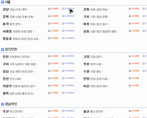 메뉴를 누르면 다양한 지역들이 정리된 페이지로 이동하게 되는데, 여기에서 벼룩시장 구인구직의 사이트처럼 일자리를 알아보고 싶은 지역을 고르고, 항목 우측에 있는 E-PAPER를 눌러주면 됩니다.