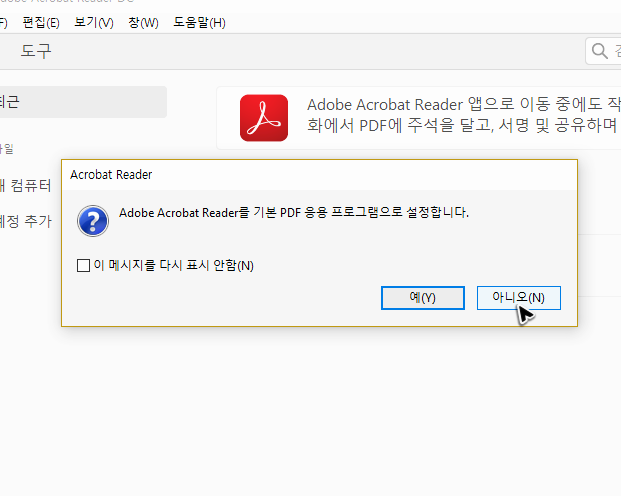 처음으로 아크로벳리더 무료의 다운로드와 실행을 하는 것이라면 기본 응용 프로그램으로 설정하겠냐는 물음이 나오는데, 기호에 따라 선택하시면 될 것 같습니다.