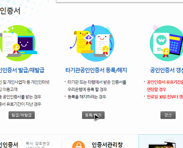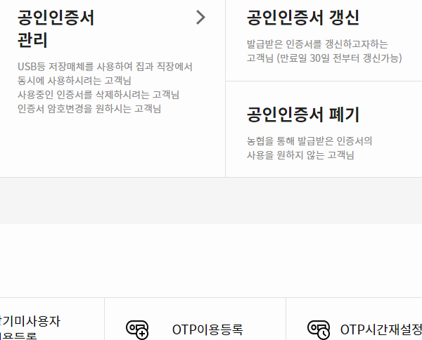 사이트에 있는 버튼을 눌러서 농협 공인인증의 센터로 이동을 했다면, 이제 발급이나 재발급, 갱신, 확인 등의 메뉴들이 보일 거예요. 여기에서 필요한 버튼을 누르고 파일을 관리하면 됩니다.