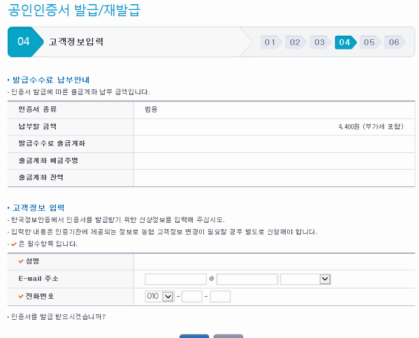 발급이나 재발급을 할 땐 총 여섯 단계를 농협의 공인인증센터에서 진행을 해주어야 하는데, 각각의 과정은 그냥 안내되는 정보를 살펴보고 빈칸을 채우는 것이 전부라서 제가 세세하게 설명할 부분이 없을 것 같아요.