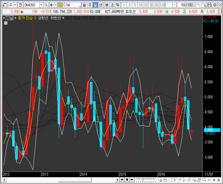 하지만 이렇게 첫 상승파를 잡는 것은 쉽지 않죠. 그래서 저라면 다날의 주가를 이렇게 공략할 것 같습니다. 주봉이나 월봉차트에서 그물망을 뚫을 때까지 기다릴 것입니다.