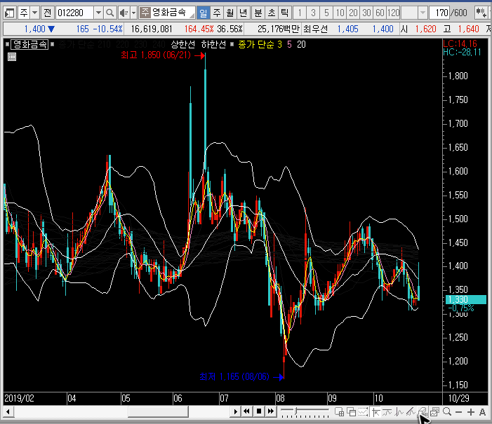 여기에서 추가 상승을 통해 월봉차트의 밴드폭을 넓힐 수 있고, 아니면 윗꼬리만 늘리는 횡보흐름이 보일 수도 있습니다. 주봉차트에서 영화금속의 주가를 봐도 딱히 다음 흐름이 보이지 않습니다.