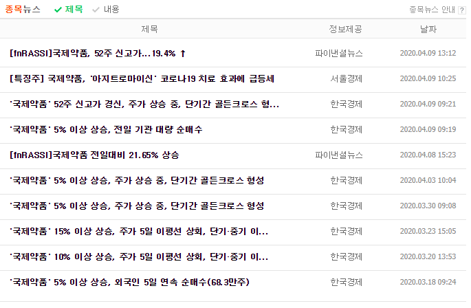 그럼 이제 국제약품의 주가를 얘기해보도록 하겠습니다. 이 종목이 갖고 있는 재료는 뉴스를 간단히 둘러봐도 알 수 있으니, 제가 따로 얘기할 내용이 없을 것 같습니다.