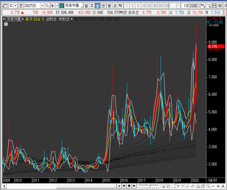 신기하게도 월봉을 보면 국제약품의 주가는 상장한 이후부터 꾸준하게 상승추세를 유지하고 있습니다. 지금은 신고가를 만들었죠. 아무래도 제가 모르는 부분이 있는 듯합니다.