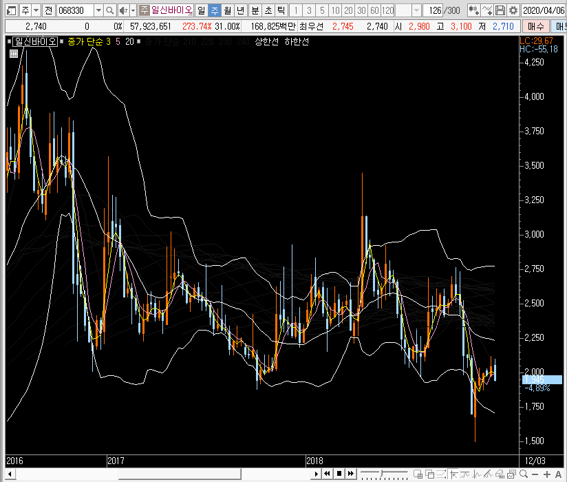 주봉차트를 보면 일신바이오의 주가가 그물망을 뚫는 모습이 보여지는데, 단기선은 아직 중심선도 넘지 못하고 있습니다. 지금부터 예상할 수 있는 흐름은 크게 세 가지일 것입니다.