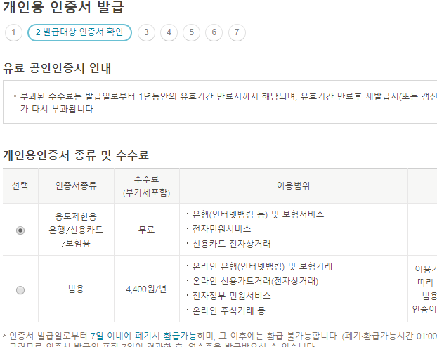총 일곱 단계를 진행해야 국민은행 공인인증서를 재발급을 할 수 있는데, 앞서 언급했듯이 그냥 빈칸을 채우면서 적당히 다음 단계를 넘어가는 것이 전부라 지금부터는 제가 특별히 설명할 내용이 없을 것 같아요.