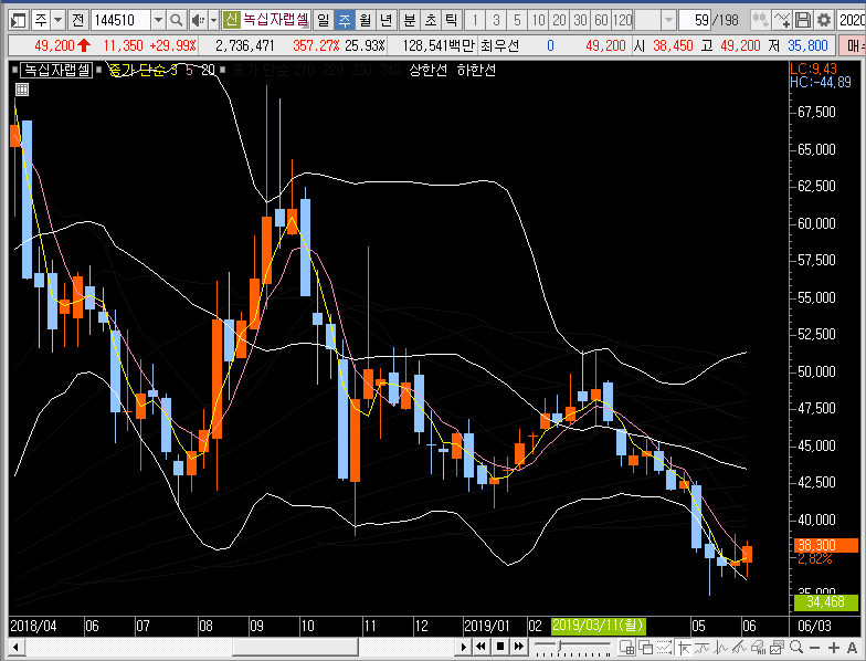 주봉차트에서는 밴드를 확장시키는 동시에 그물망까지 뚫어버리는 모습이 나왔으니, 단기적인 관점으로 3일선이나 5일선까지 녹십자랩셀의 주가가 눌림이 들어올 때 지지력을 확인하고 따라붙어 보는 것도 나쁘지 않을 듯합니다.