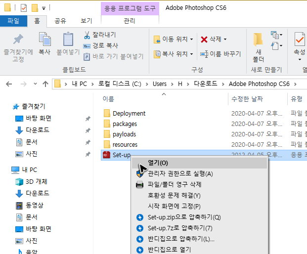 저처럼 CS6을 선택해서 포토샵 무료를 다운하면 아래 그림처럼 압축된 파일이 받아질 거예요. 모두 다 받은 뒤에는 압축을 풀어주면 됩니다. 압축 해제 과정은 우 클릭을 해서 메뉴를 누르면 되니, 따로 설명하지 않아도 괜찮겠죠?