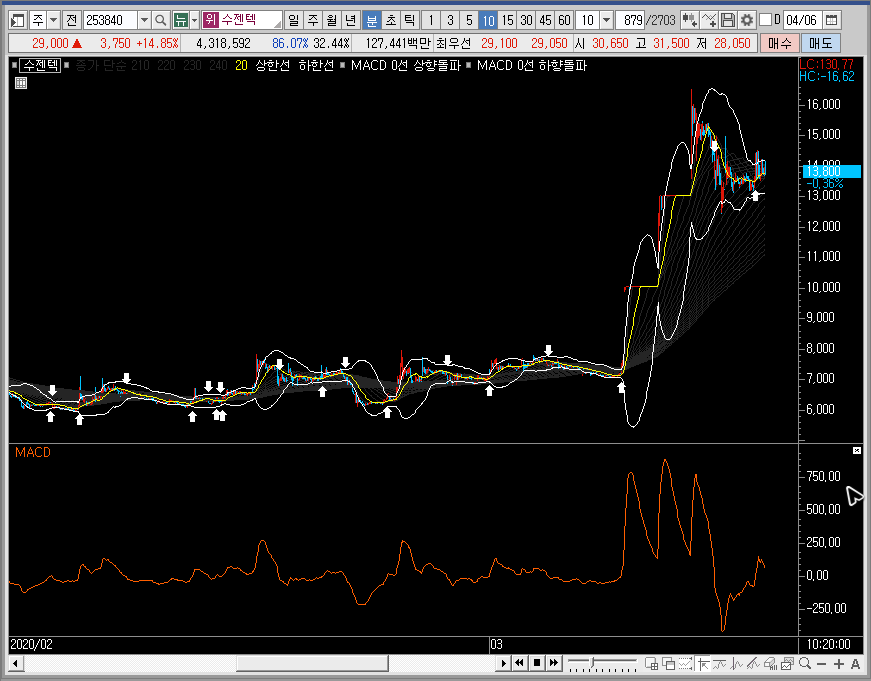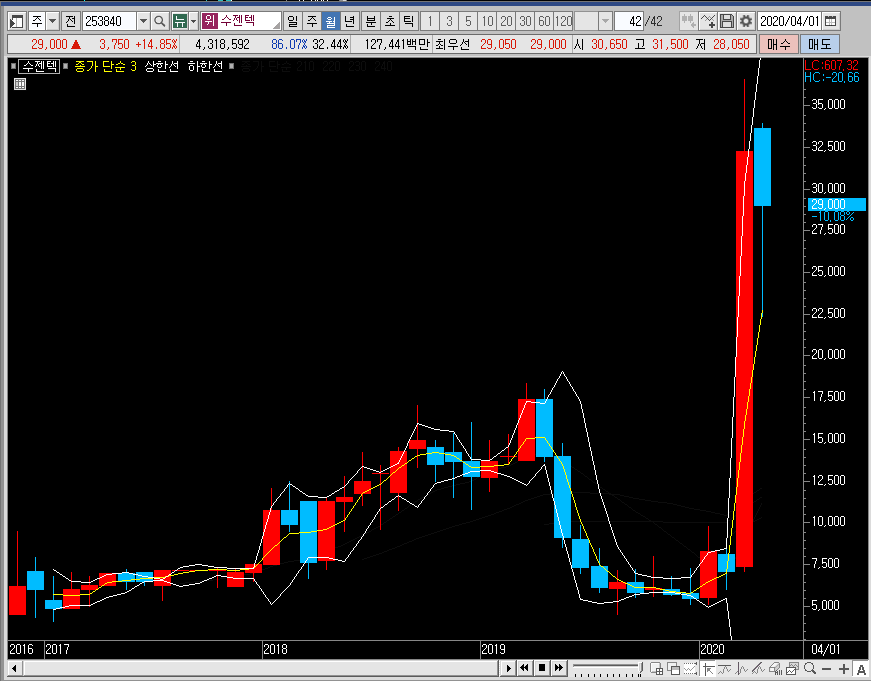 월봉차트를 보면 하락하고 몇 달동안 횡보를 한 뒤에 변동성을 키우더니 갑자기 지금의 상승파가 나온 것을 알 수 있습니다. 즉, 안목이 있으셨던 분들이라면 횡보구간이나 횡보구간 상단이 뚫릴 때 수젠텍의 주가를 공략하셨을 것입니다.
