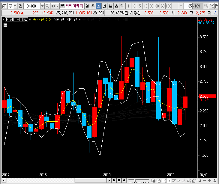 이 종목과 관련된 테마의 종류는 간단한 검색만 해봐도 알 수 있고, 불확실성에 대한 부분은 저보다 이 글을 읽는 분들이 더 잘 알고 계실 것 같습니다. 그러니 저는 차트를 보면서 티케이케미칼의 주가를 얘기해보도록 하겠습니다.