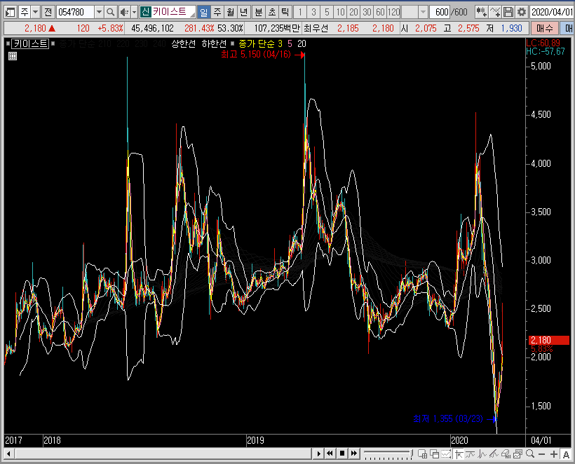 주봉차트로 넘어와서 키이스트의 주가를 보면 확장된 밴드의 하단을 건드린 뒤에 양봉으로 되돌림을 주는 모습을 볼 수 있는데, 변동성 패턴이라 이 상태로 중심선을 뚫고 지지한다면 밴드 상단까지도 열린 상태가 될 수 있을 것입니다.