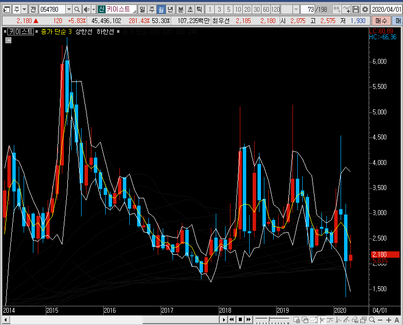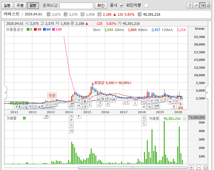 그러니 저는 차트에서 키이스트의 주가를 살펴보고 앞으로의 그림을 예측해보도록 하겠습니다. 우선 월봉차트입니다. 월봉으로 보면 상장했을 당시에 비해선 상대적으로 낮은 위치에 있습니다.