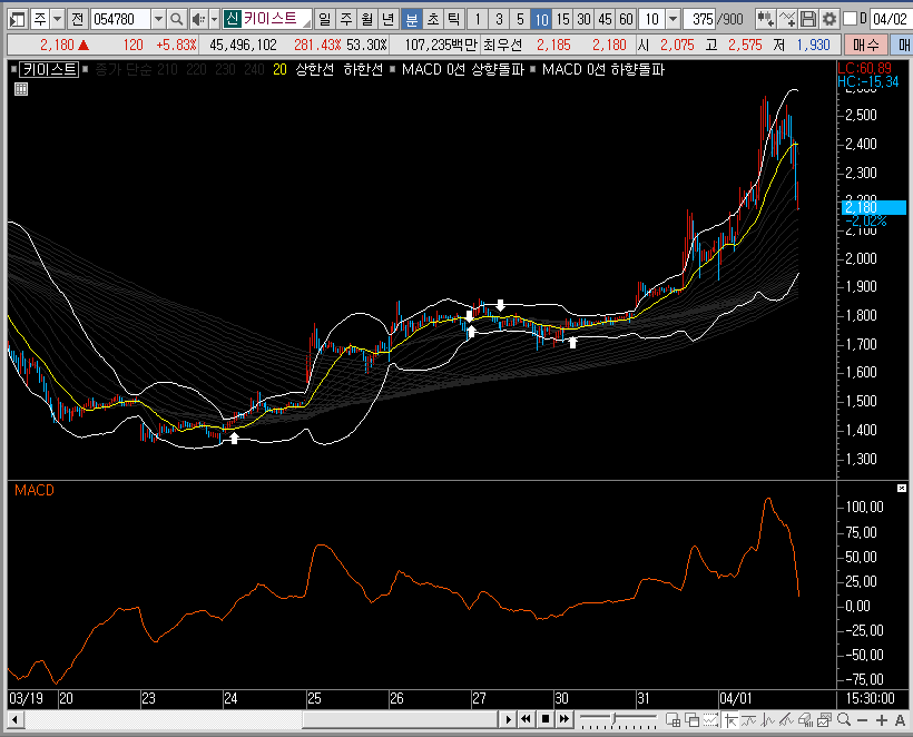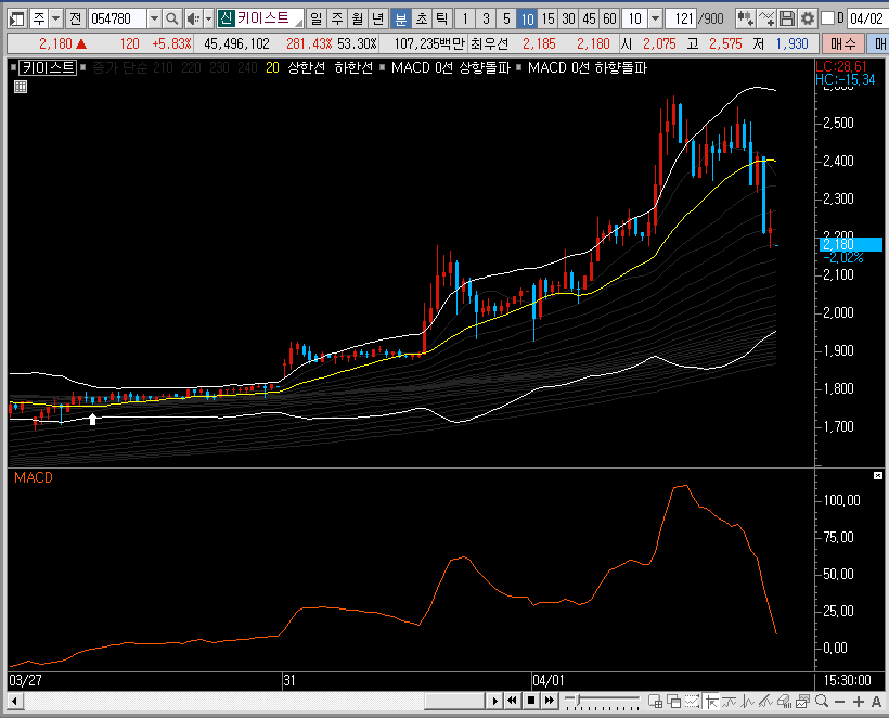 즉, 일봉 차트에서 밴드 상단을 뚫고 다시 밴드를 확장하는 키이스트의 주가가 보여야 하는데, 당장에는 이런 움직임을 섣불리 예측할 수 없는 상태이니 관망을 하는 것이 좋을 듯합니다.