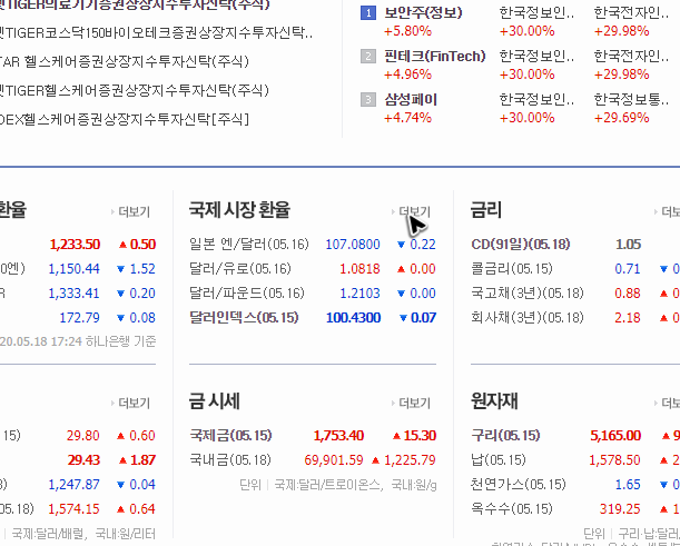 앞서 하나은행의 환율조회할 때와 마찬가지로 사이트를 찾아가도 바로 USD나 JPY 등의 가격 정보가 보이지 않습니다. 여기에서도 메뉴를 눌러야 하는데, 일단 가장 아래쪽에 있는 가격 그룹의 더보기를 눌러주세요.