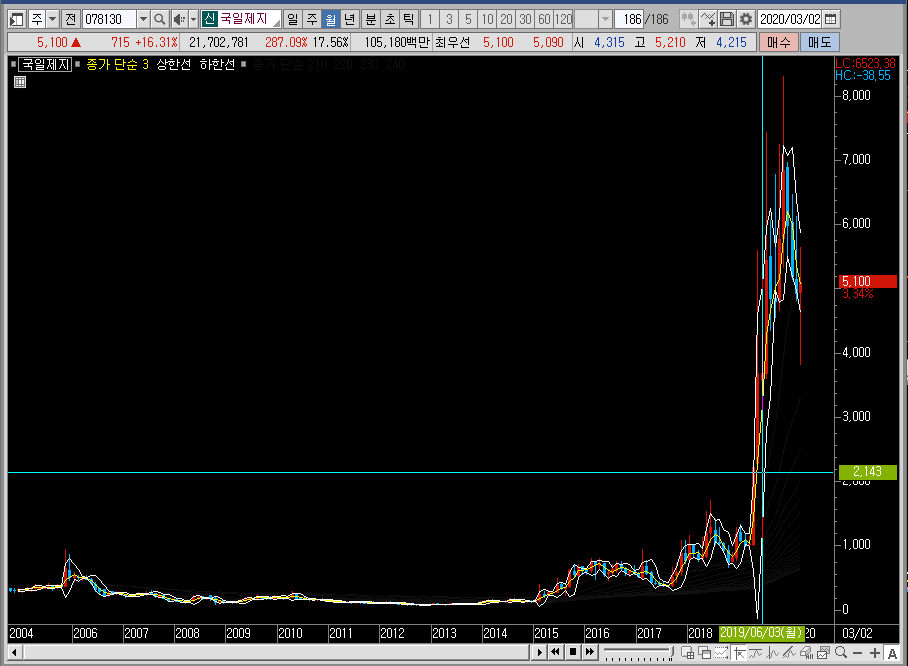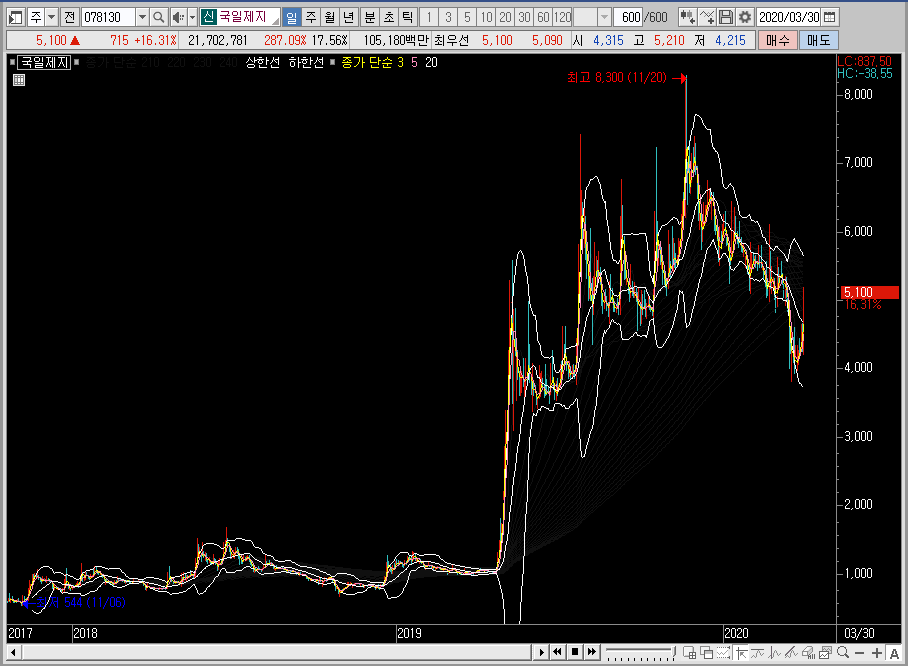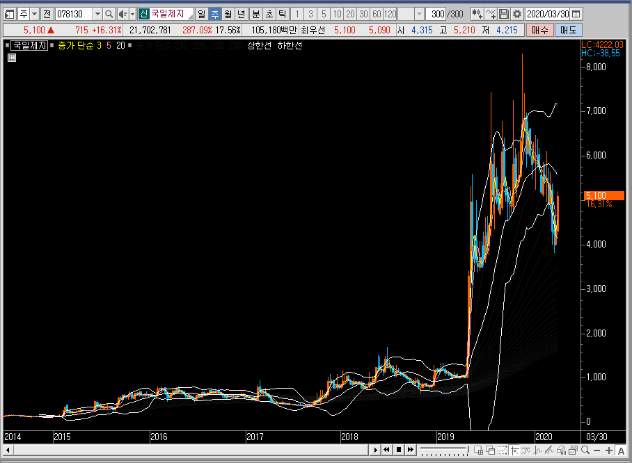 우선 월봉 차트에서 국일제지의 주가를 보면 100 아래에서 놀고 있었던 차트가 어느순간 상승 추세를 만들더니, 지금은 엄청나게 오른 모습을 볼 수 있습니다. 이런 모양을 보면 장기적으로 가져가고 싶다는 생각이 들기도 합니다.