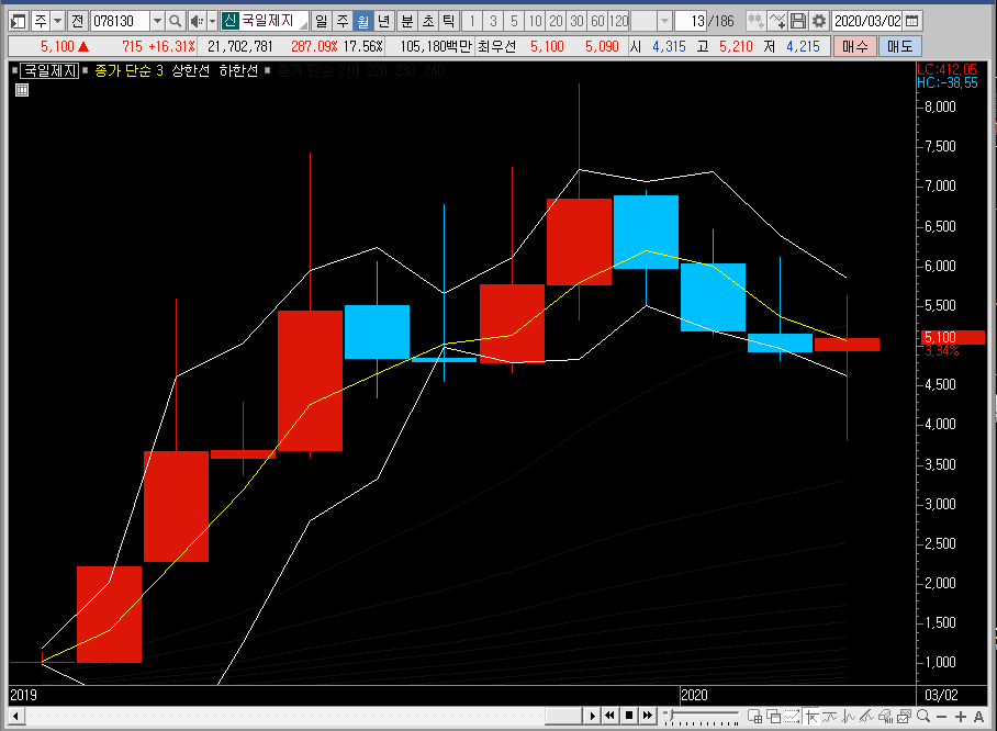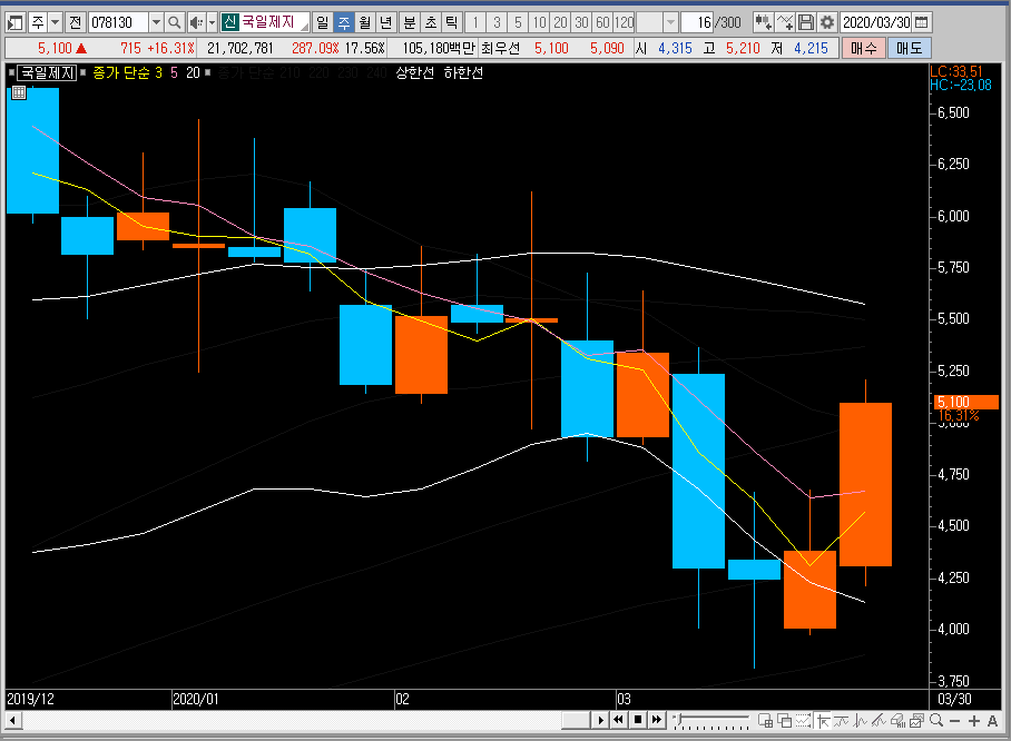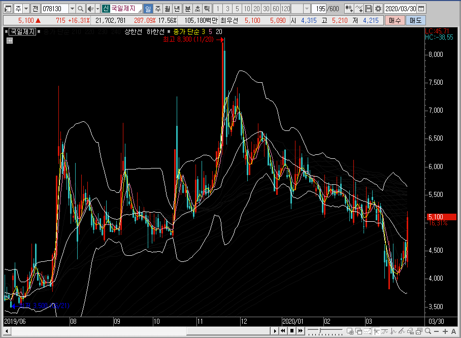 주봉차트로 넘어와서 국일제지의 주가를 보면 밴드를 아래쪽으로 확장한 뒤에 반등이 나오는 중입니다. 아직은 중심선을 뚫지 않은 모습이죠. 중심선을 어떻게 뚫어주느냐에 따라 밴드 위쪽으로 나갈지 아니면 재조정이 들어올지가 결정이 될 것 같습니다.