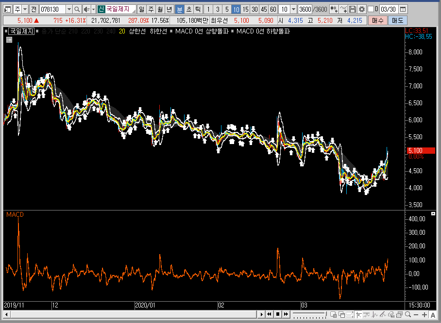 일봉차트에서 국일제지의 주가를 보면 상승대비 적당한 수준으로 조정이 들어온 상태인데, 여기에서 밴드 상단선까지 바로 달려간 뒤에 그대로 그물망까지 뚫어주는 모습을 보여준다면 진입해도 좋을 듯합니다.
