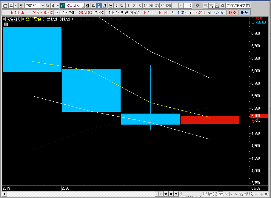 그래서 월봉차트를 줄인 뒤에 국일제지의 주가를 보면 이번 달은 특별한 일이 없다면 양봉으로 마감할 확률이 높을 듯합니다. 개인적으로 하락세가 약해지면서 음봉마감을 기대했는데 아쉽군요.