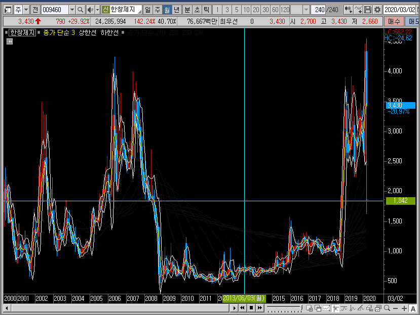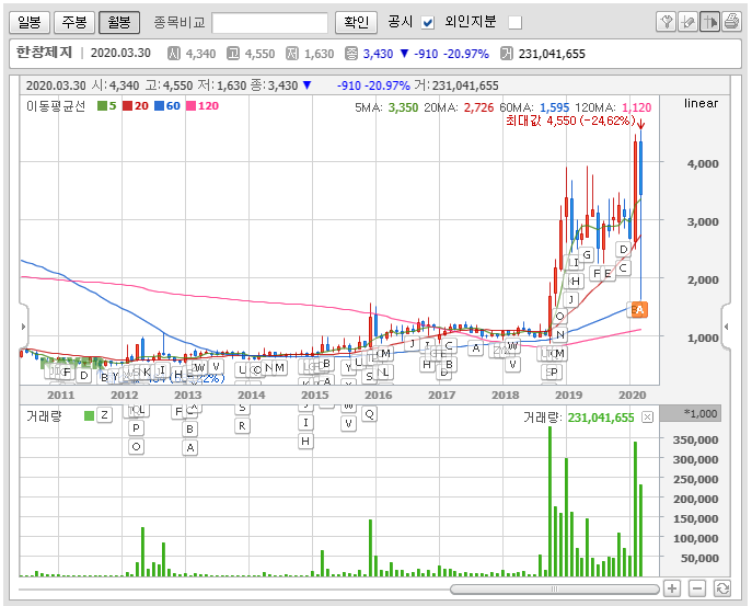 일단 월봉차트로 한창제지의 주가를 보면 바닥을 몇 년 동안이나 다지고 있었던 종목이 어느 순간 상승하는 흐름을 보이더니, 급등패턴과 함께 이제는 고점을 갱신하게 되었습니다.