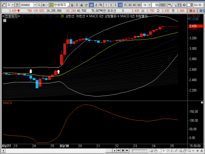 그래서 만약 선물차트라면 저는 밴드 하단에서 한창제지의 주가를 공략했을 것 같습니다. 하지만 여기는 선물이 아니죠? 그렇기 때문에 이미 많이 오른 종목이라는 것을 기억하고 소극적으로 대응하는 것이 더 좋은 선택이 아닐까 합니다.
