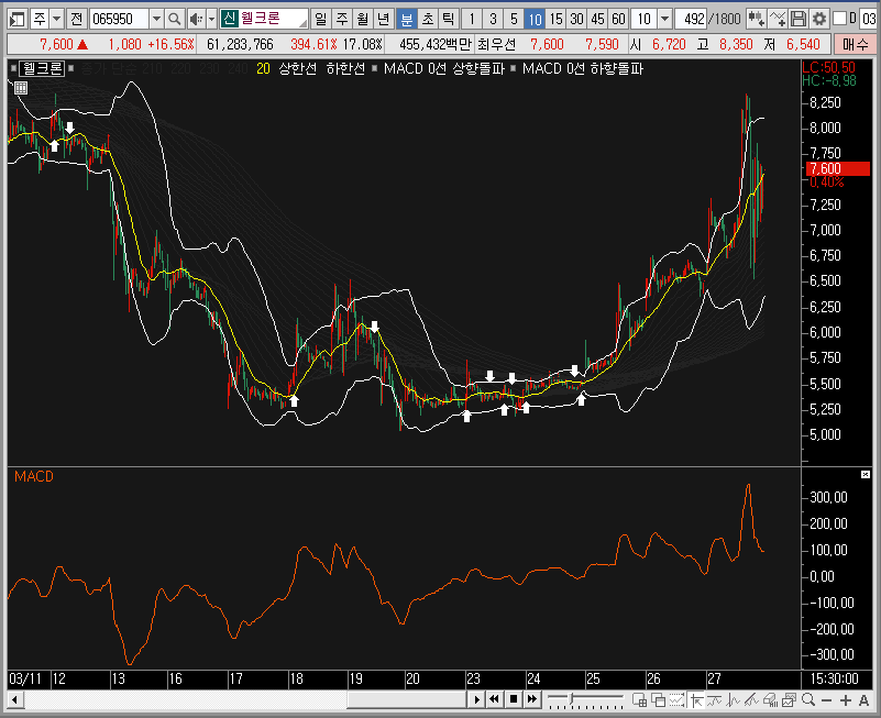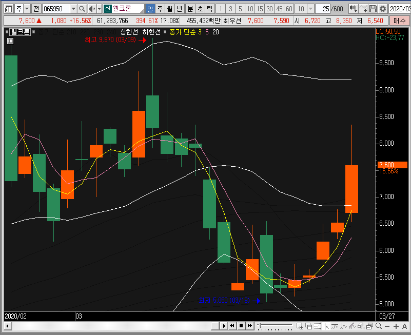 일봉차트에서도 밴드 하단을 지지하면서 상승하는 모습을 보여주고 있는데, 밴드 하단을 건드렸을 때 주봉차트의 모습이 웰크론의 주가가 중심선을 지지하는 모양이었으니 정말 좋은 자리였던 것 같습니다.