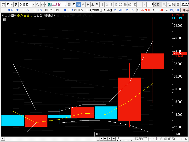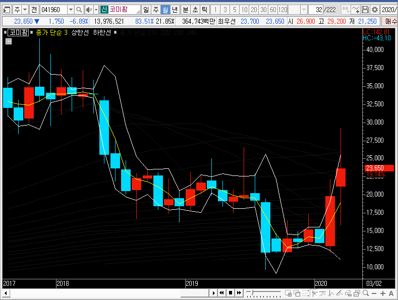 하지만 지금은 재료를 갖고 코미팜의 주가가 움직이는 중이며, 이미 알고 계시겠지만 사실 실적이 좋은 회사도 아닙니다. 그래서 월봉차트의 큰 그림은 어쩌면 전혀 의미가 없을지도 모릅니다.