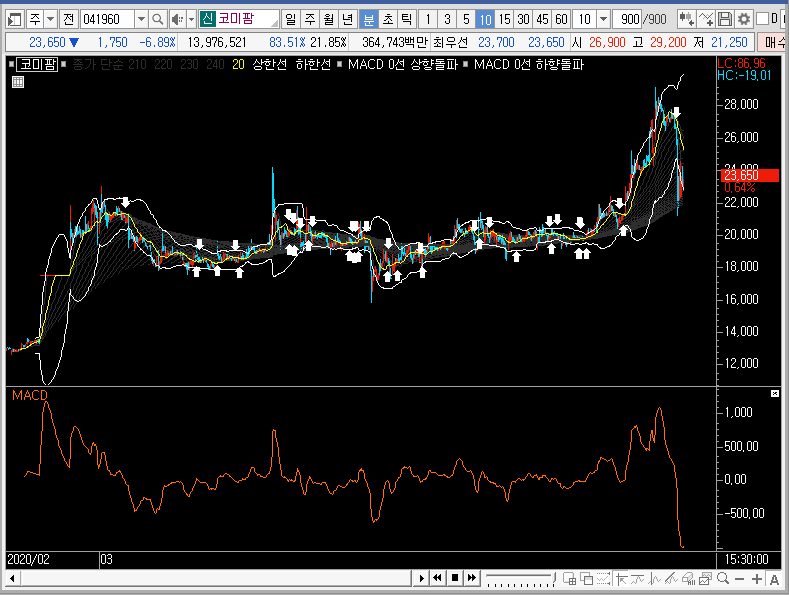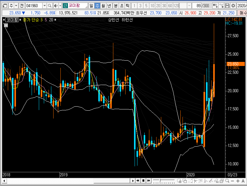 만약 코미팜의 주가가 추가적인 상승을 한다면 그물망 상단을 뚫은 뒤에 그 자리를 지지하는 모습을 보여줄 것이고, 그렇지 않다면 주봉차트의 중심선이나 밴드 하단까지 조정을 받을 것입니다.
