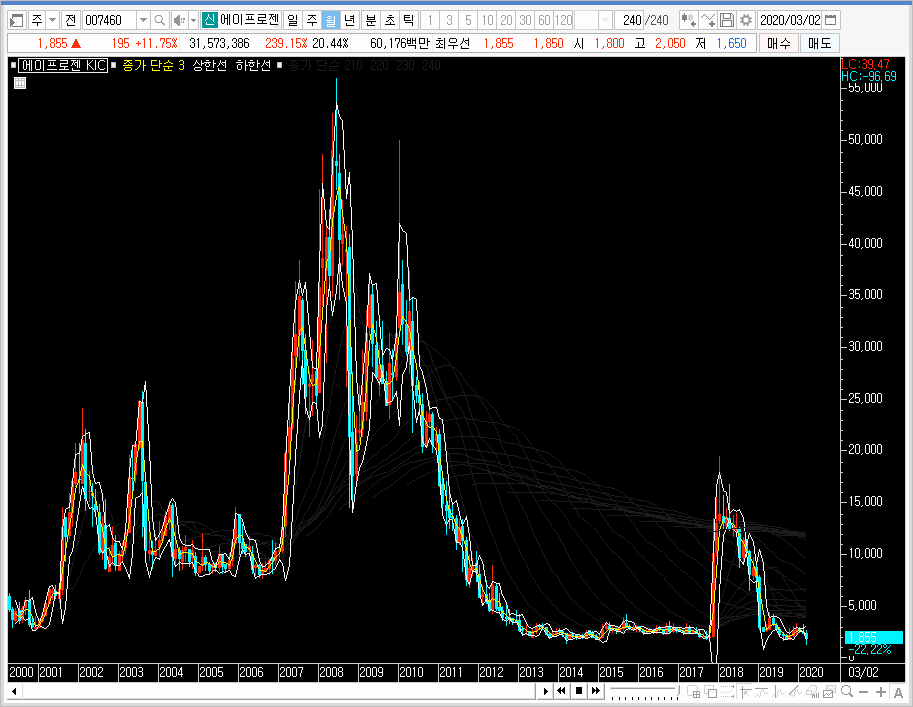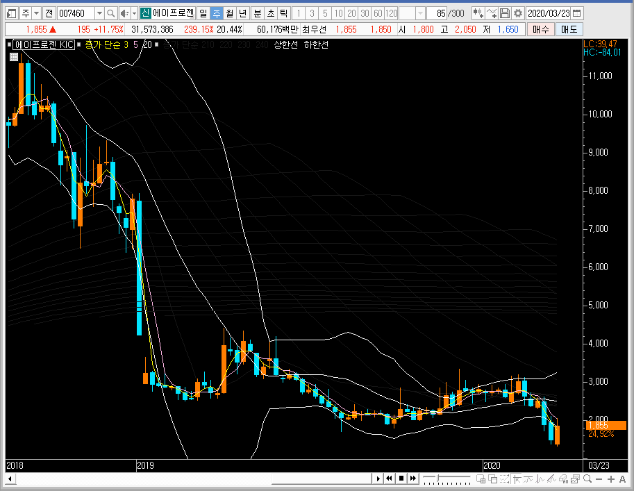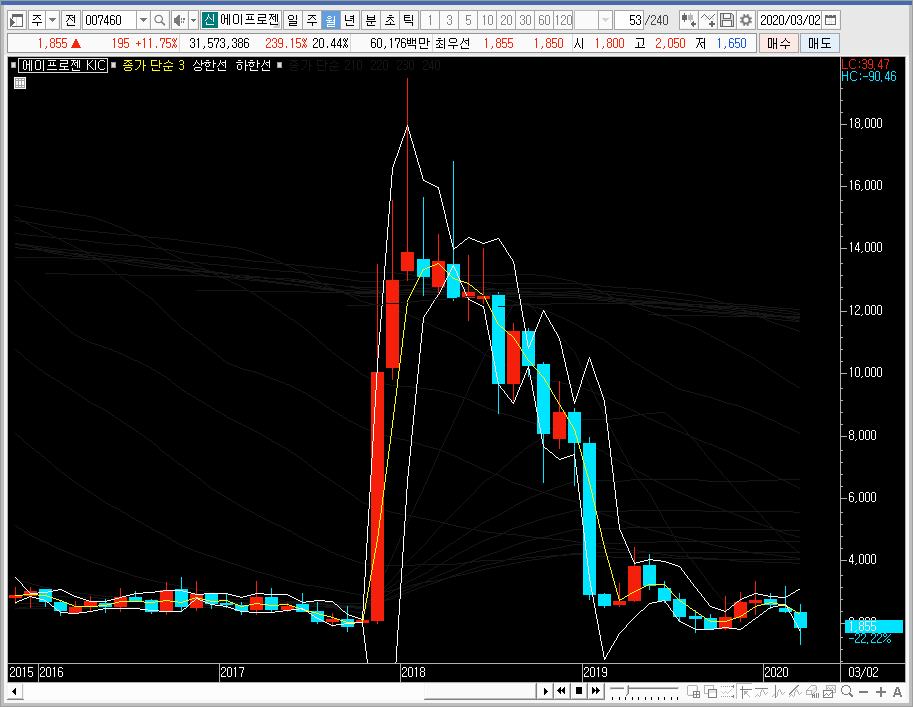 일단 월봉차트에서 에이프로젠 KIC의 주가를 보면 말 그대로 바닥에 있는데, 이 동네는 바닥 아래에 지하가 있을 수 있으니, 차트상 바닥이라는 이유로 덜컥 진입하고 모아갈 수는 없는 노릇이죠?