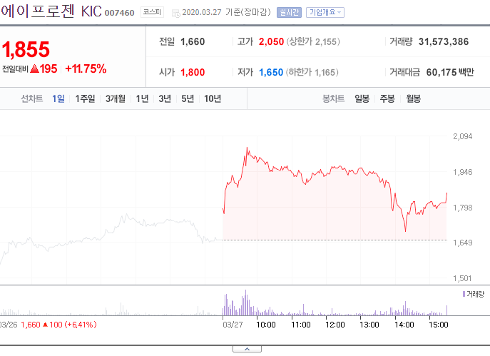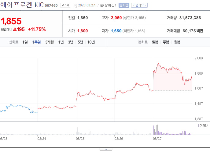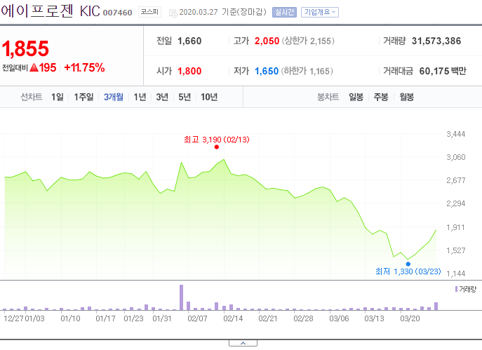 지금 이 종목이 반등을 준비하는 이유, 차트의 흐름에 영향을 줄 수 있는 원인은 제가 얘기를 하더라도 이미 다 알고 계실 내용들 밖에 없을 듯합니다. 그러니 차트를 보며 에이프로젠의 KIC 주가를 확인하도록 하겠습니다.