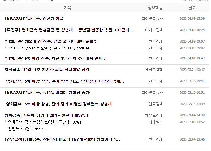 그리고 제 얘기는 투자판단용으로 적당하지 않기 때문에 혹시 투자판단을 위한 영화금속의 주가 정보를 찾고 있으시다거나, 다른 괜찮은 종목을 알고 싶으시다면 저보다는 전문적인 곳을 통해서 정보를 수집할 것을 권장합니다.