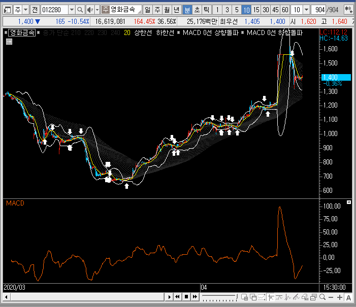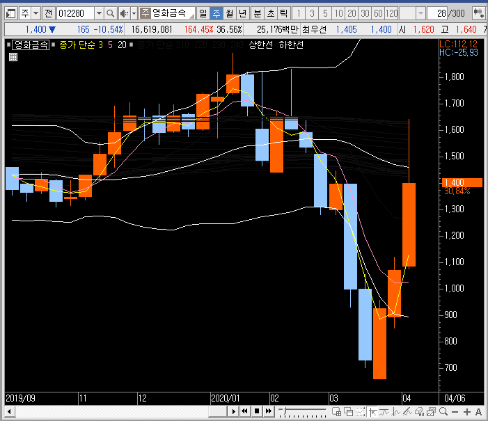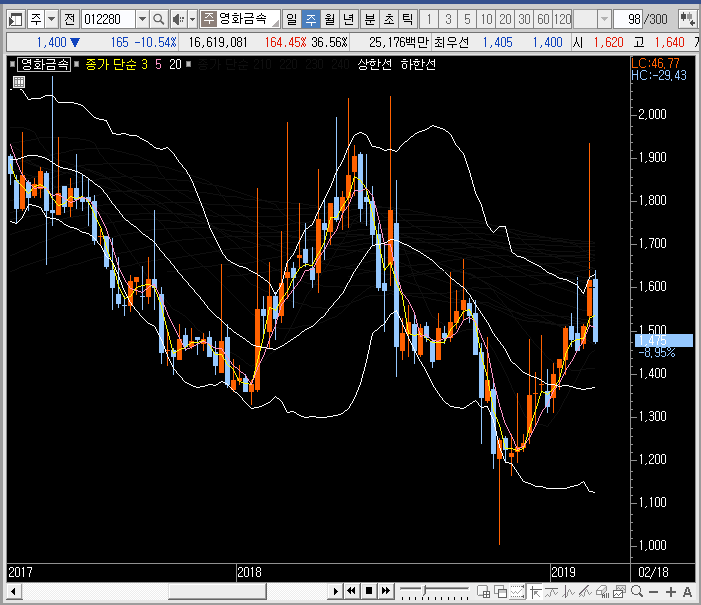 여기에서 추가 상승을 통해 월봉차트의 밴드폭을 넓힐 수 있고, 아니면 윗꼬리만 늘리는 횡보흐름이 보일 수도 있습니다. 주봉차트에서 영화금속의 주가를 봐도 딱히 다음 흐름이 보이지 않습니다.