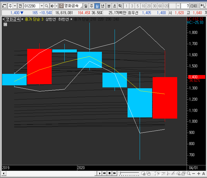 그런 의미에서 월봉차트부터 보겠습니다. 월봉차트로 영화금속의 주가는 하락추세에 있으며, 최근 네 달 동안 꼬리가 긴 음봉을 그리다가 드디어 양봉이 나오는 것을 확인할 수 있습니다.