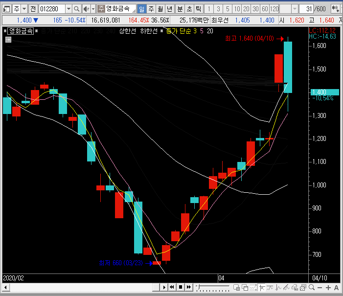 그대로 상승하는 영화금속의 모습이 나온다면 그냥 놓치고 관망하는 것이 좋은 전략이 될 것 같습니다. 여담으로 이렇게 시나리오를 만들어도 개인적으로 이 종목은 그리 공략해보고 싶다는 생각이 들지 않는 종목이군요.